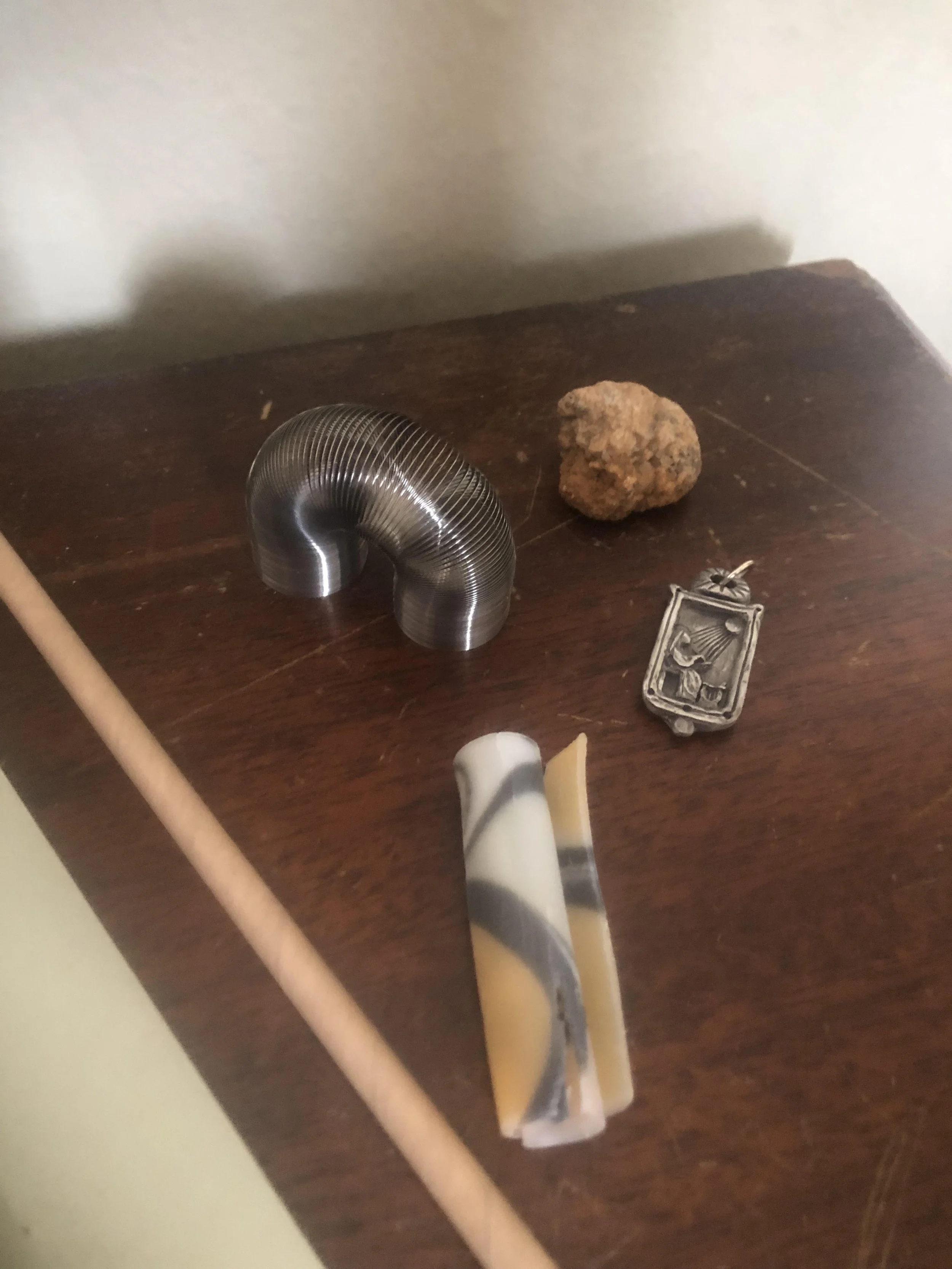 clockwise- world’s smallest slinky, river rock, st. Hildegard pendant, homemade soap bar scraping, compostable straw
